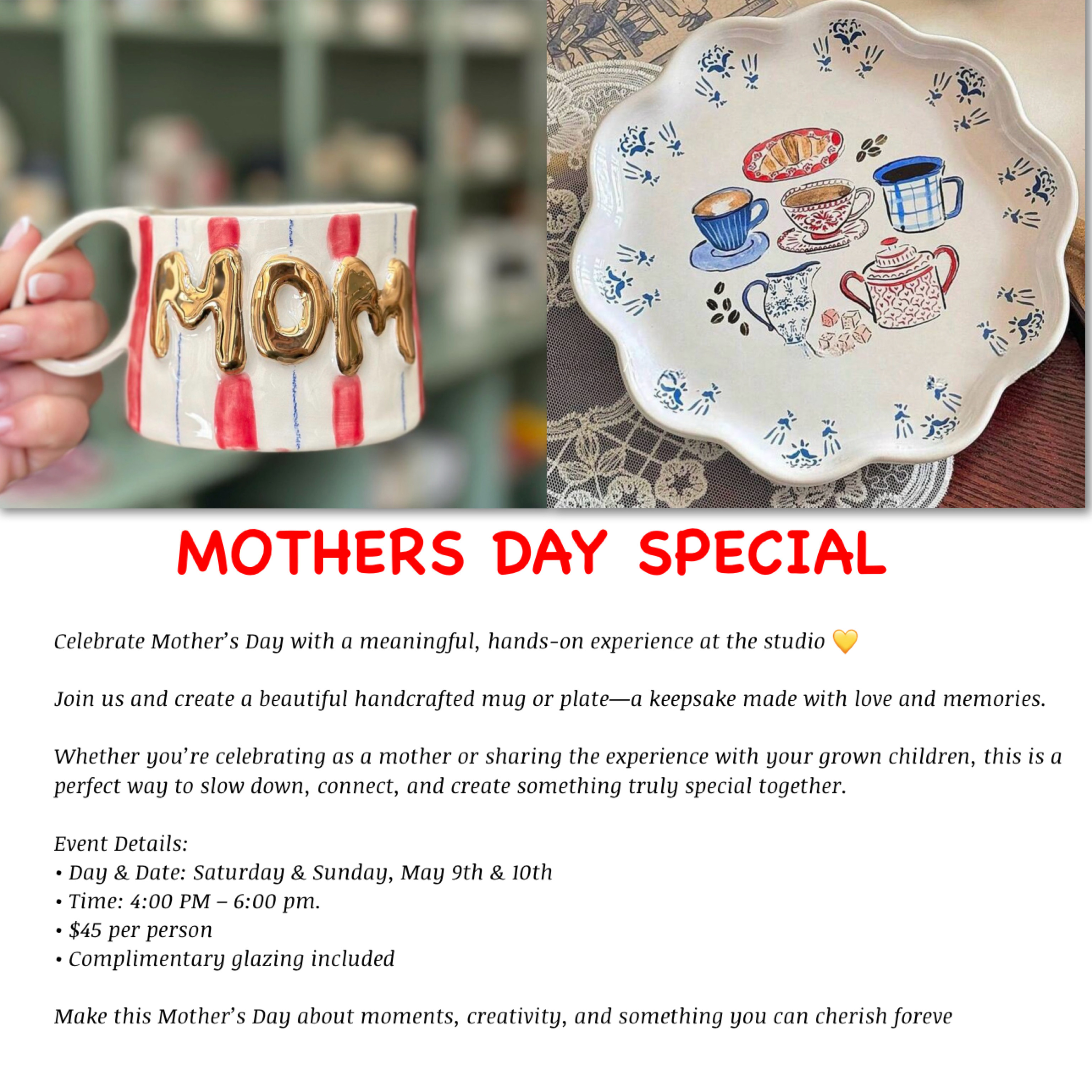 Celebrate Mother’s Day at The Spinning Wheel ATX! Create a beautiful ceramics Mug or Plate – a keepsake made with love and memories.